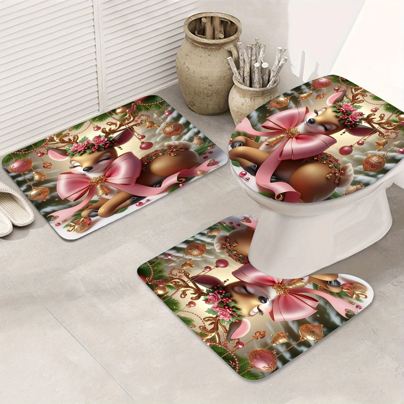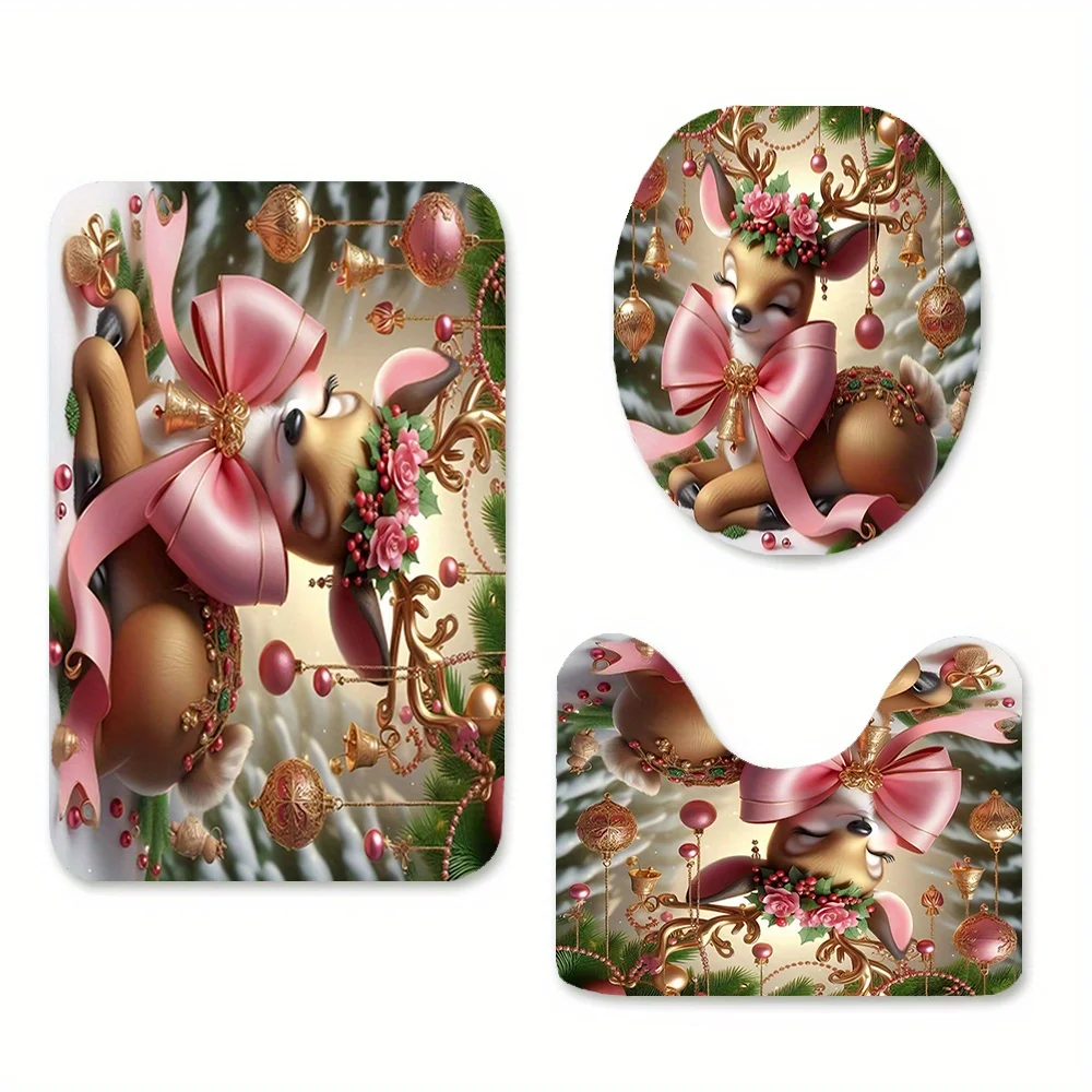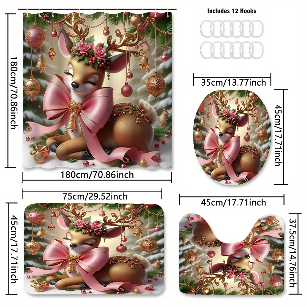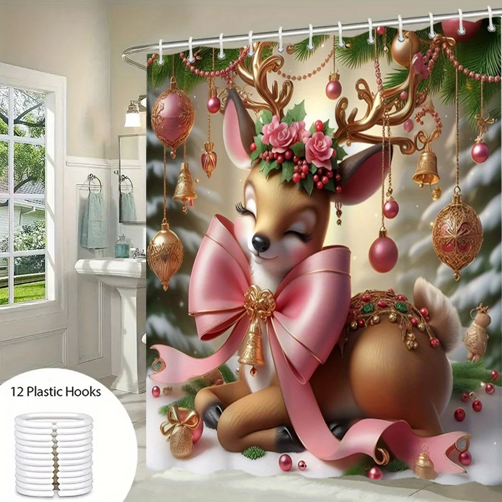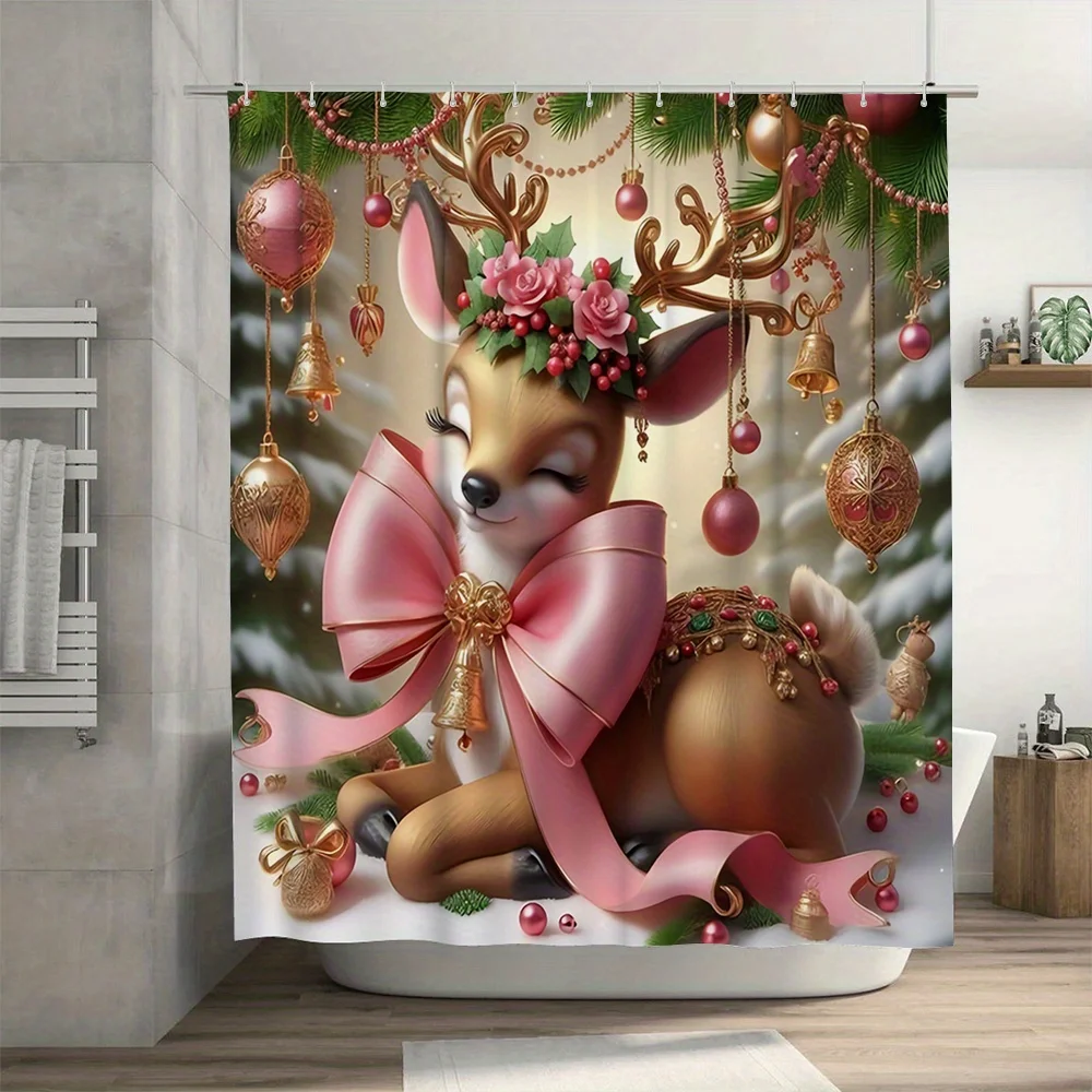 This Christmas reindeer shower curtain and mat set brings instant holiday magic to your bathroom. Moreover, the detailed artwork features a sweet deer, pink ribbons, golden bells, and bright ornaments. Therefore, the scene feels joyful, cozy, and perfect for winter gatherings. Additionally, the background shows soft snow and fir branches, which enhance the warm seasonal mood. Also, the high-definition digital print stays vivid through many washes. Furthermore, the colors resist fading and keep their cheerful glow. Because the design uses balanced tones, it coordinates with white tile, wood accents, and metallic fixtures. Likewise, it pairs well with holiday towels, candles, and greenery. In fact, the set turns a daily routine into a festive ritual. Next, the charming bow details add elegance without overwhelming the space. Then, the friendly deer character delights kids and guests alike. Besides, the art keeps a refined look for adult spaces as well. Consequently, this set works for main bathrooms and guest suites. Finally, the theme stays stylish beyond the holidays, since nature elements feel timeless.