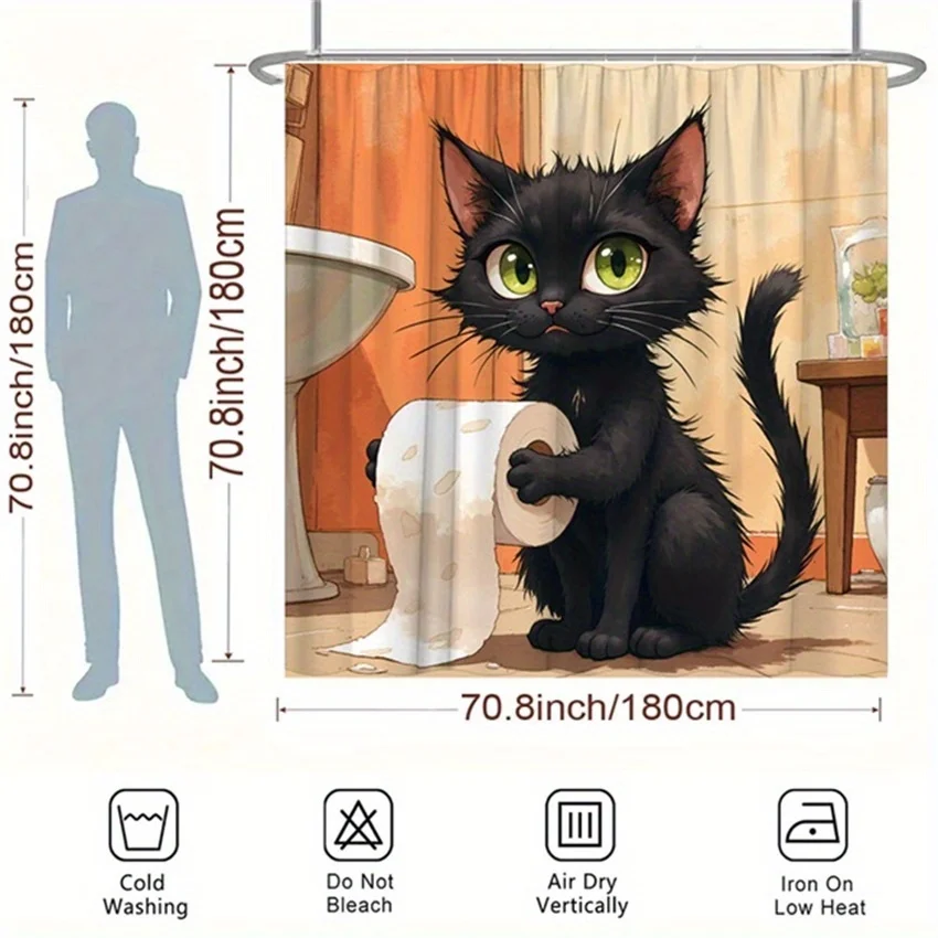 Bring humor and personality to your bathroom with this Black Cat with Toilet Paper Shower Curtain. Featuring a cartoon-style cat with bright green eyes holding a toilet paper roll, this curtain instantly creates a fun and welcoming atmosphere. It’s a delightful way to add character to your space while keeping it stylish.