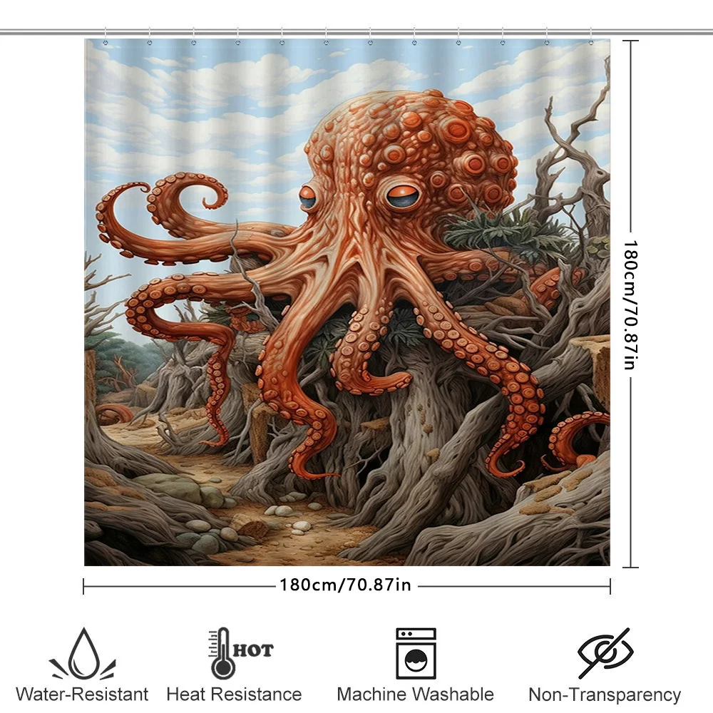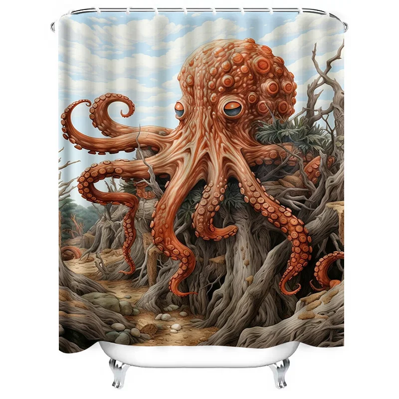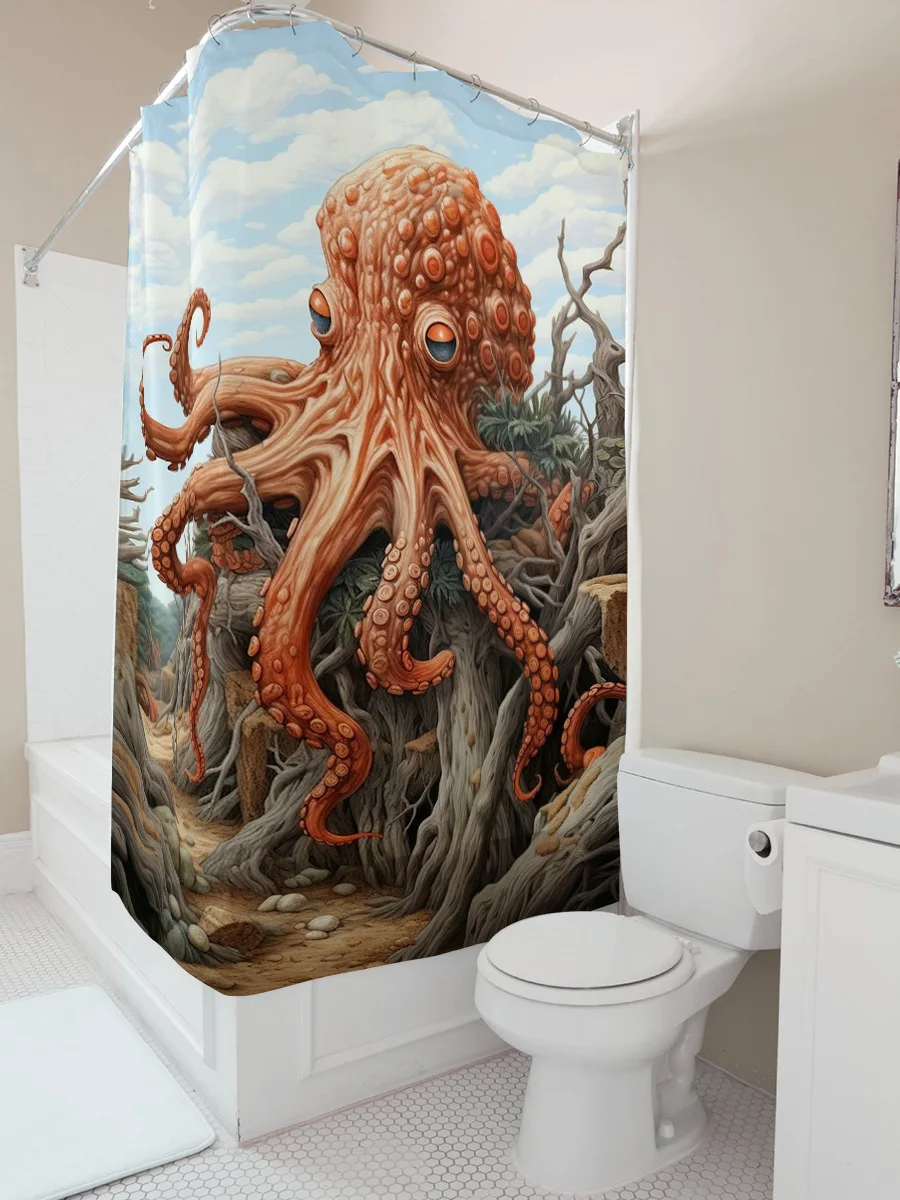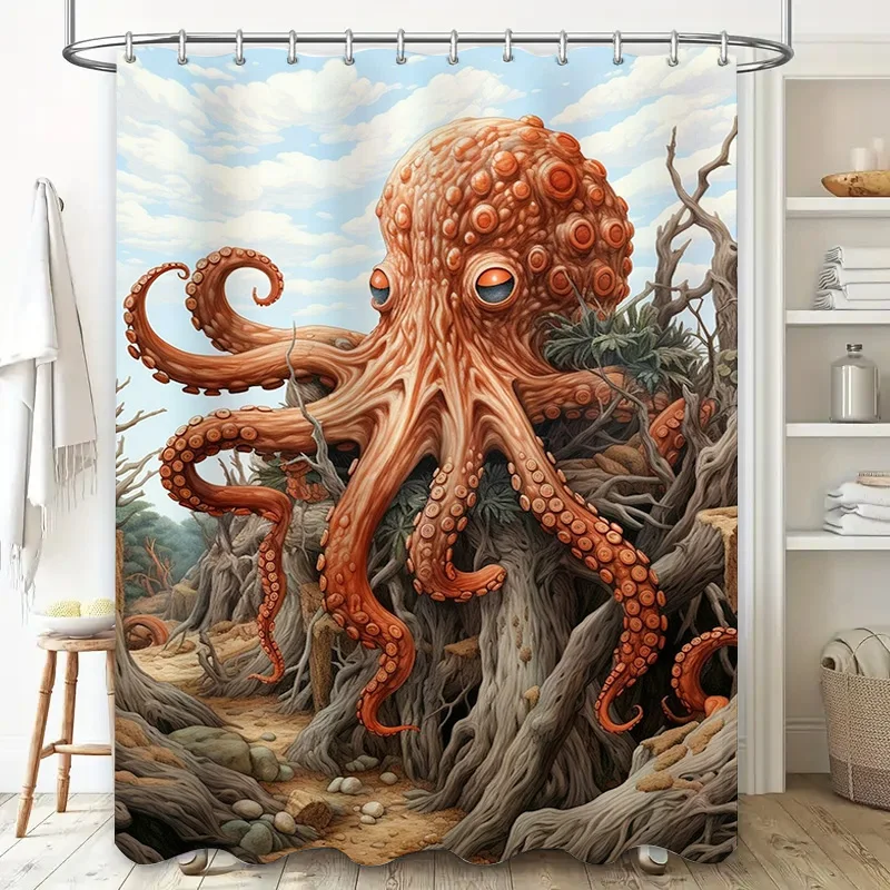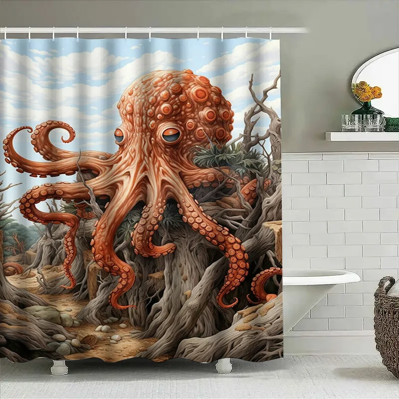 The Giant Octopus Forest Shower Curtain brings a vivid and immersive experience to your bathroom decor. Its unique design, featuring a majestic octopus amidst a serene forest, turns your daily shower into a tranquil escape. Perfect for those who love marine life and want to bring a touch of nature indoors.