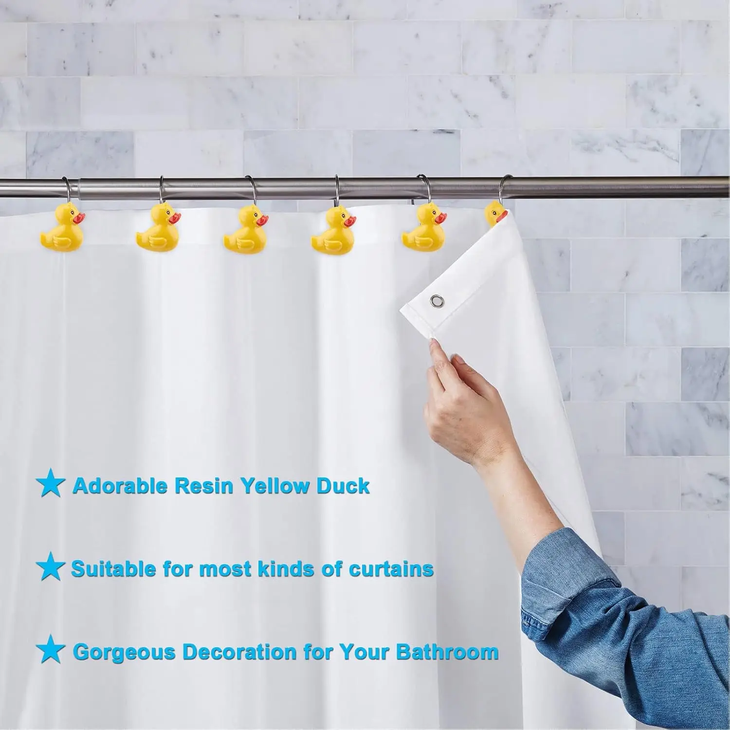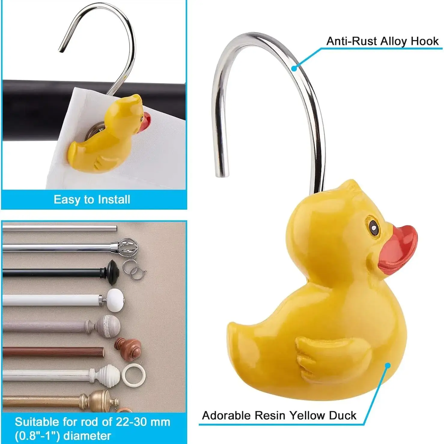 Installing the Rubber Duck Shower Curtain Hooks – 2Pcs Cute Yellow Ducks is a breeze, thanks to their intuitive design. Simply slip them onto your shower rod, and they securely hold your curtain in place. The user-friendly setup saves time and effort, making these hooks an excellent choice for any homeowner.