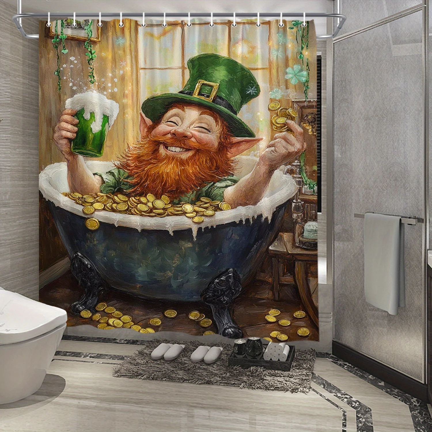 This St. Patricks Day Leprechaun with Beer and Gold Coins shower curtain offers effortless installation, making it a versatile addition to any bathroom. Whether you’re embracing the holiday spirit or simply adding a touch of charm, it accommodates various interior styles with ease.
