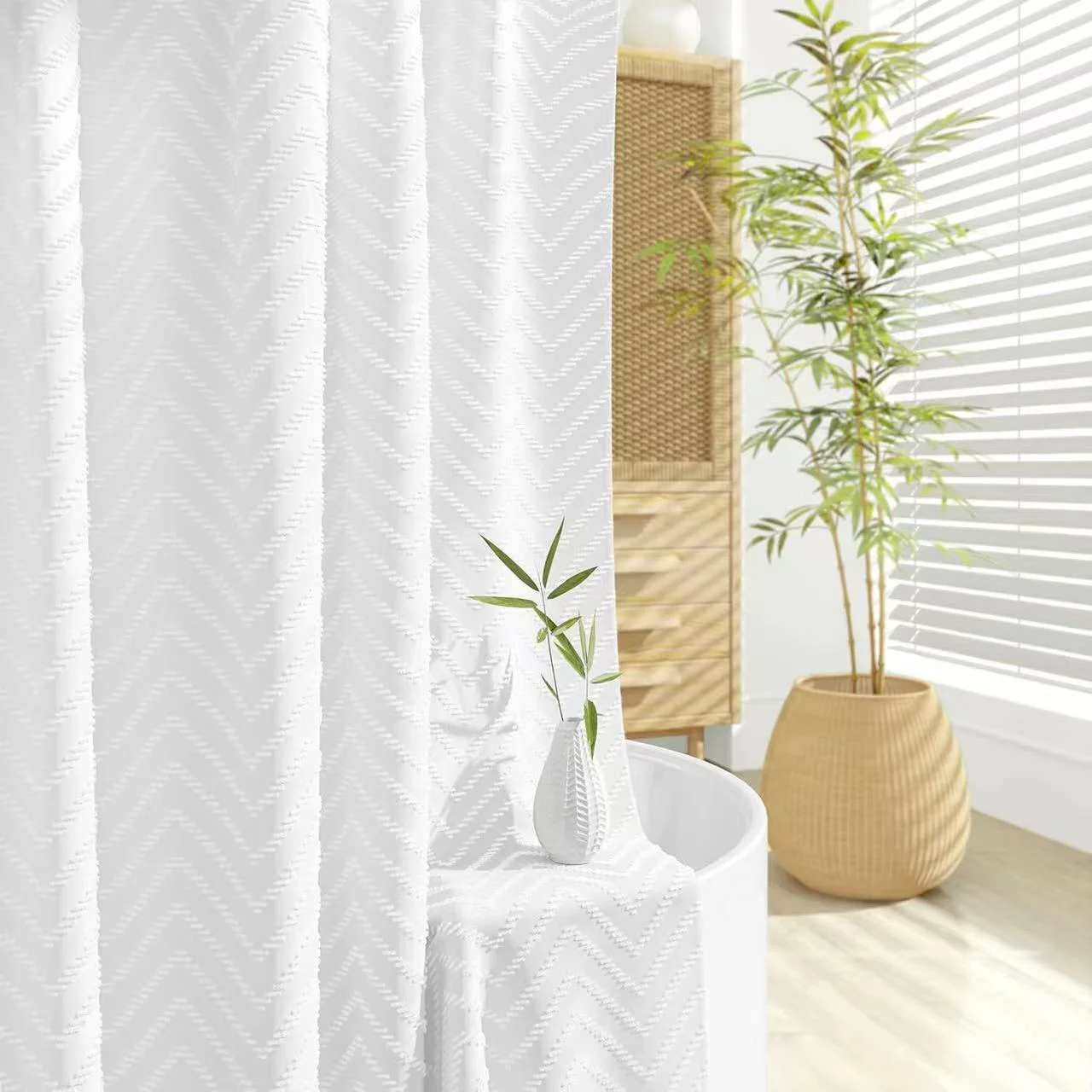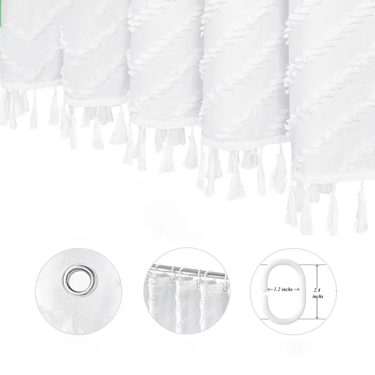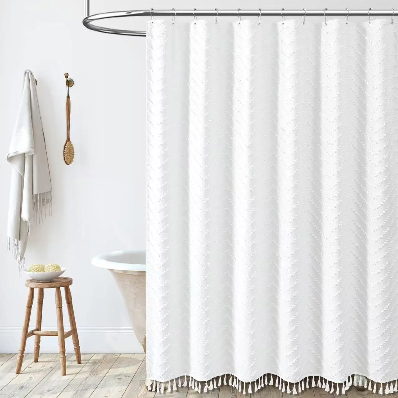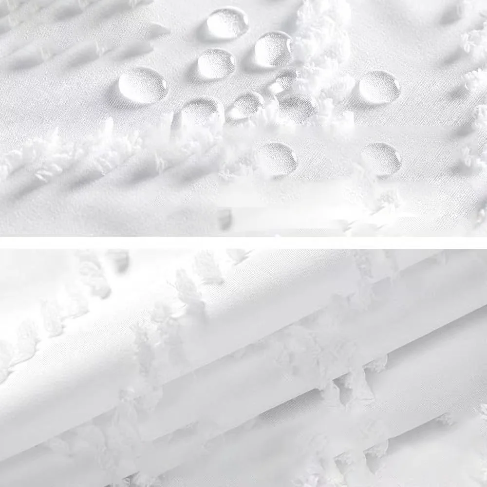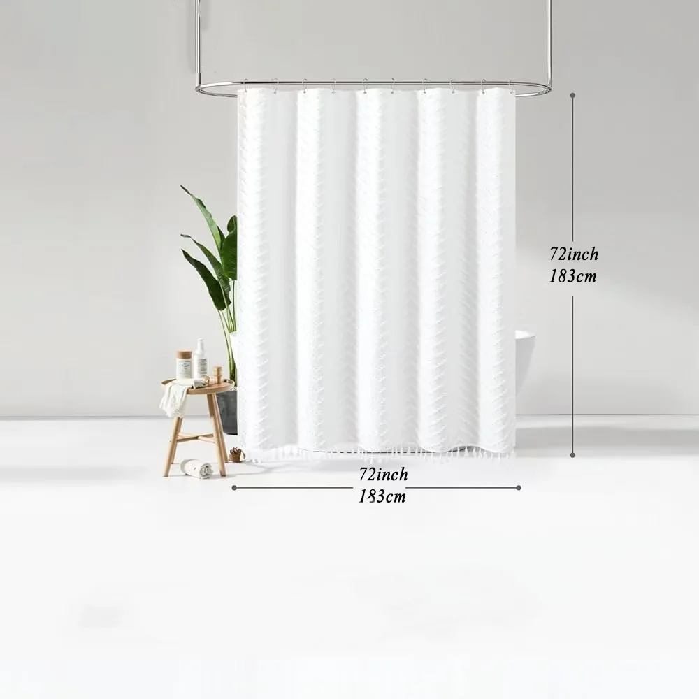 Choosing the White Textured Tassel Shower Curtain means opting for quality and design. Crafted for durability, this shower curtain stands out with its long-lasting polyester material that provides a sturdy yet elegant option for your bathroom decor needs.